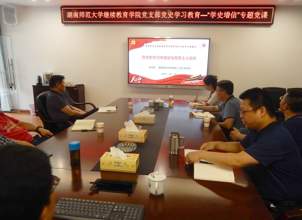 5月10日下午,继续教育学院党支部举行党史学习教育,邀请马克思主义学院陈德祥教授宣讲“学史增信”专题党课。院党支部书记吴跃飞主持会议,全体党员和教职工参加了学习。