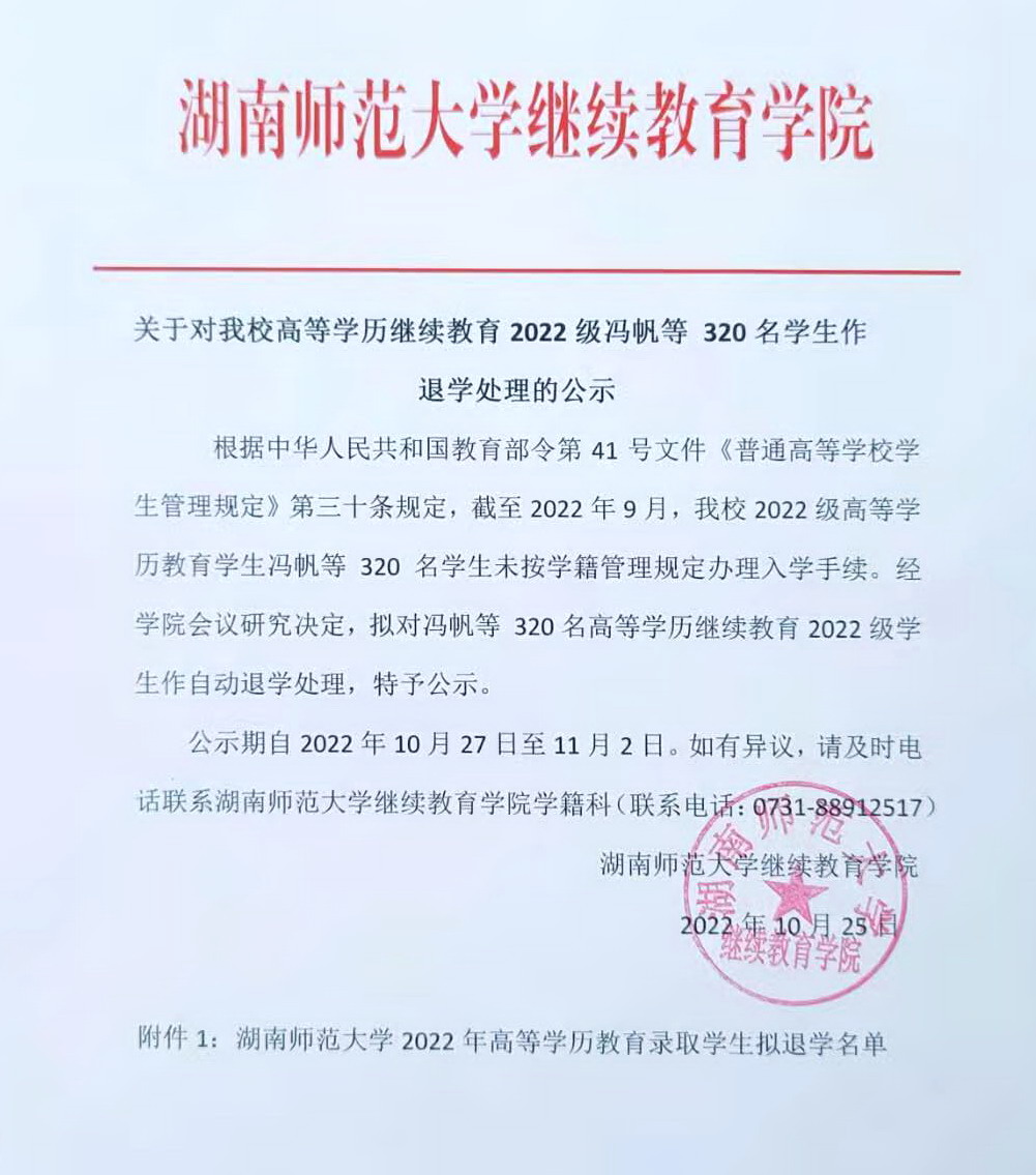 关于我校高等学历继续教育2022级冯帆等320名学生作退学处理的公示