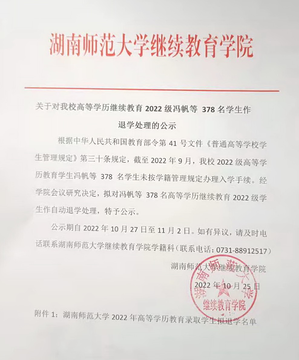 关于我校高等学历继续教育2022级冯帆等378名学生作退学处理的公示