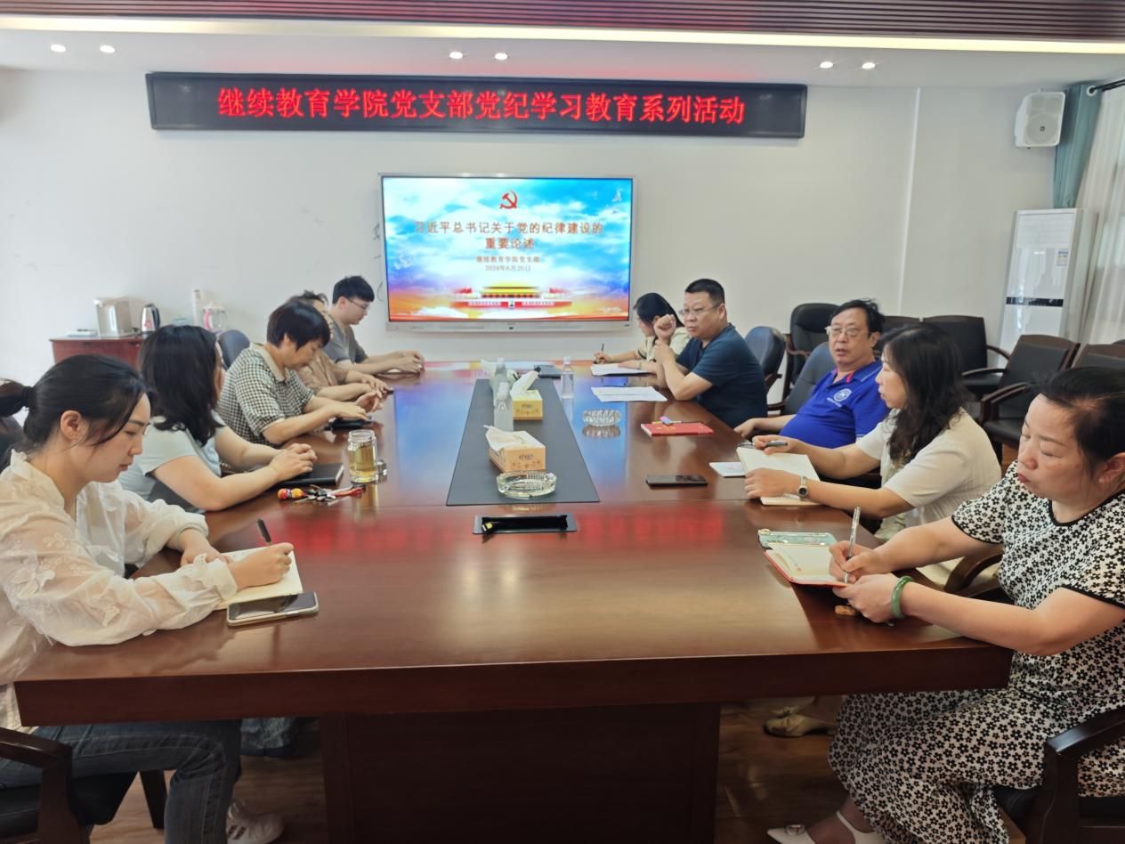 根据学校党纪学习教育工作专班要求和机关党委的安排部署,6月20日上午,继续教育学院党支部在一楼会议室开展了“习近平总书记关于党的纪律建设的重要论述”的专题学习和研讨。会议由支部书记吴跃飞主持,全体党员参加了会议。