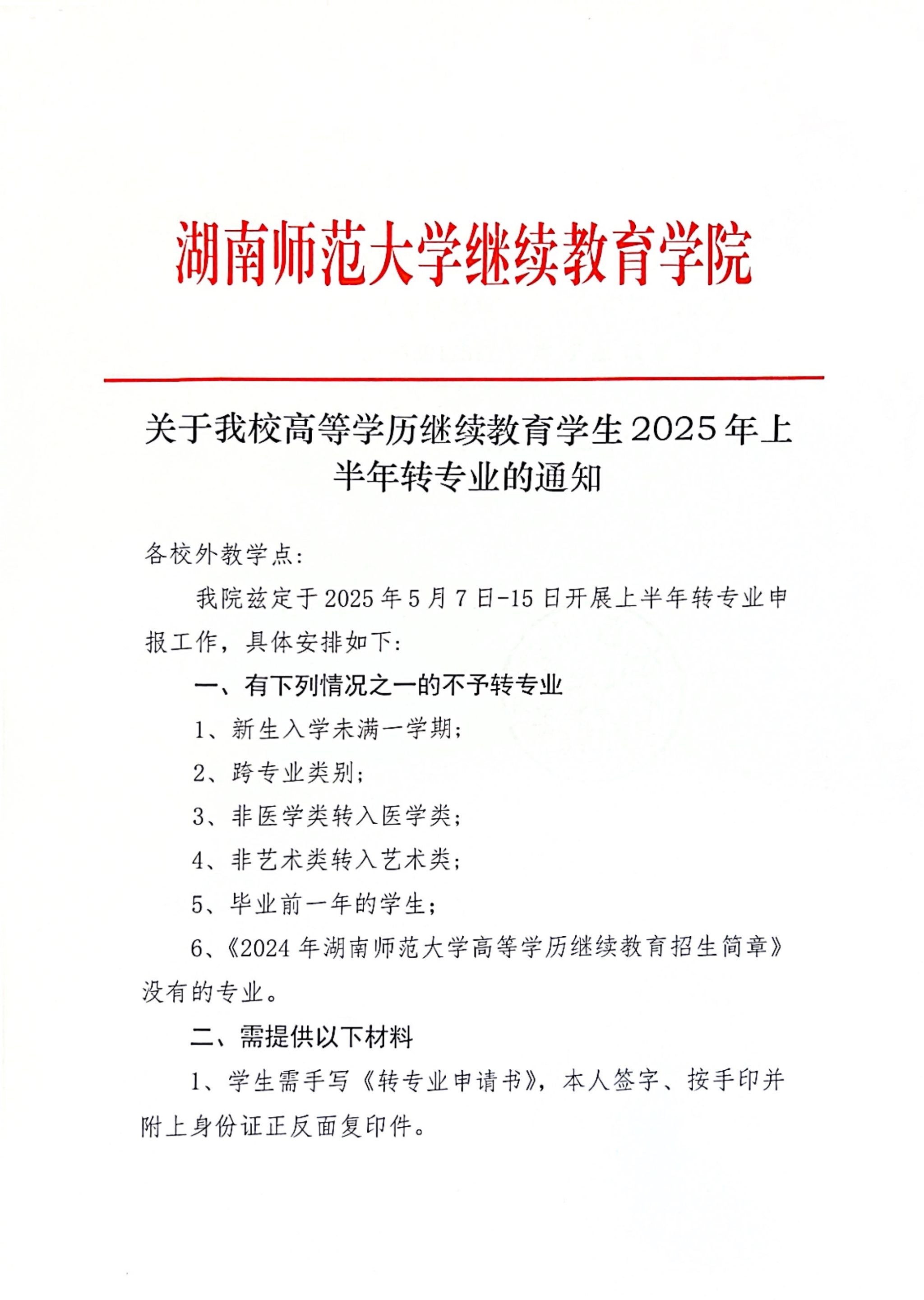 关于我校高等学历继续教育学生2025年上半年转专业的通知
