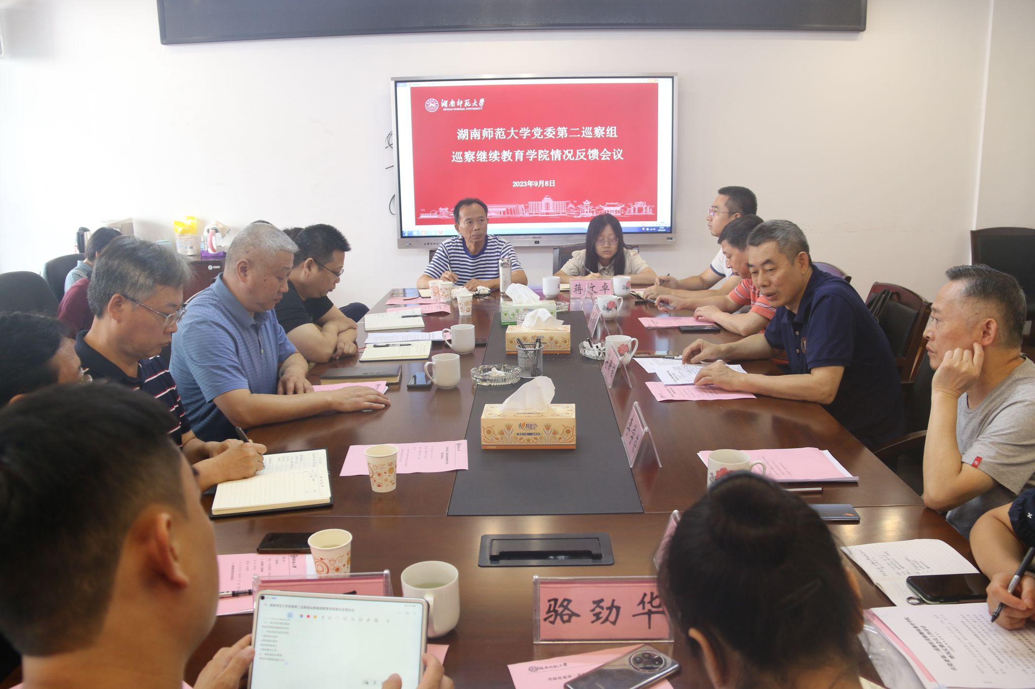 李学荣代表巡察组反馈党委巡察情况。反馈意见评价了继续教育学院的总体情况。指出了学院在政治建设、内部管理、党风廉政建设、人才队伍建设、基层党建等方面的问题和不足。从落实党的政治建设要求、落实全面从严治党要求、落实党的组织路线等方面提出了意见建议。